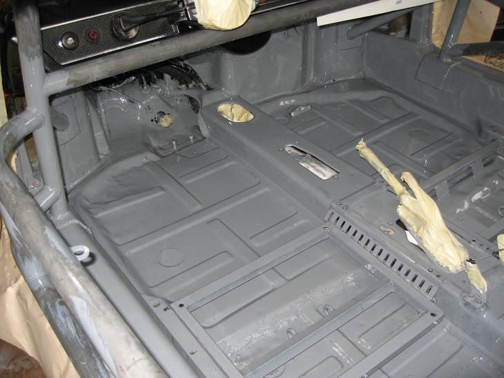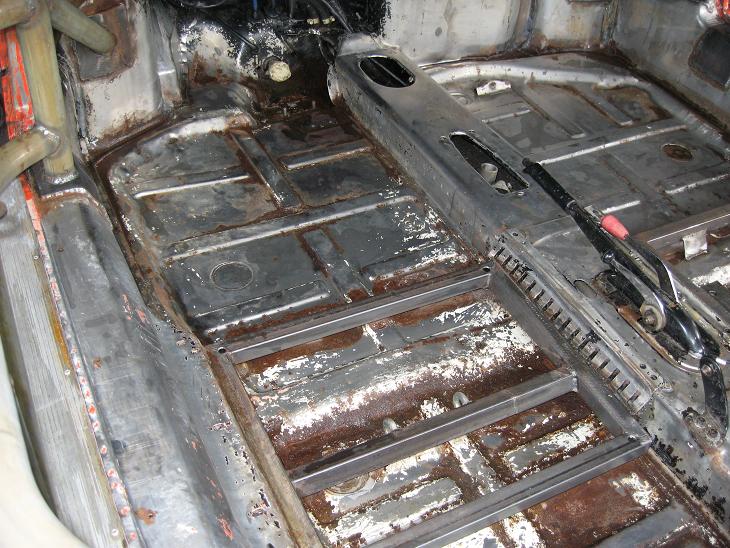 Here is what the interior looked like after removing the seats, removing the sound proofing, and using a rotary brush on the surface rust.